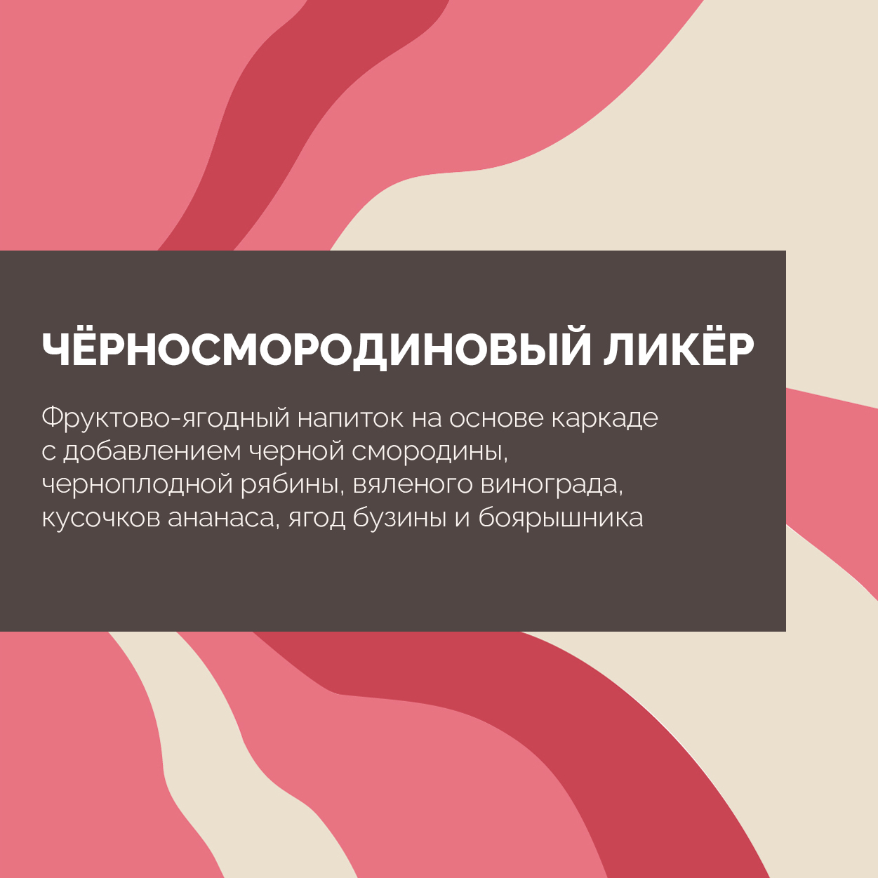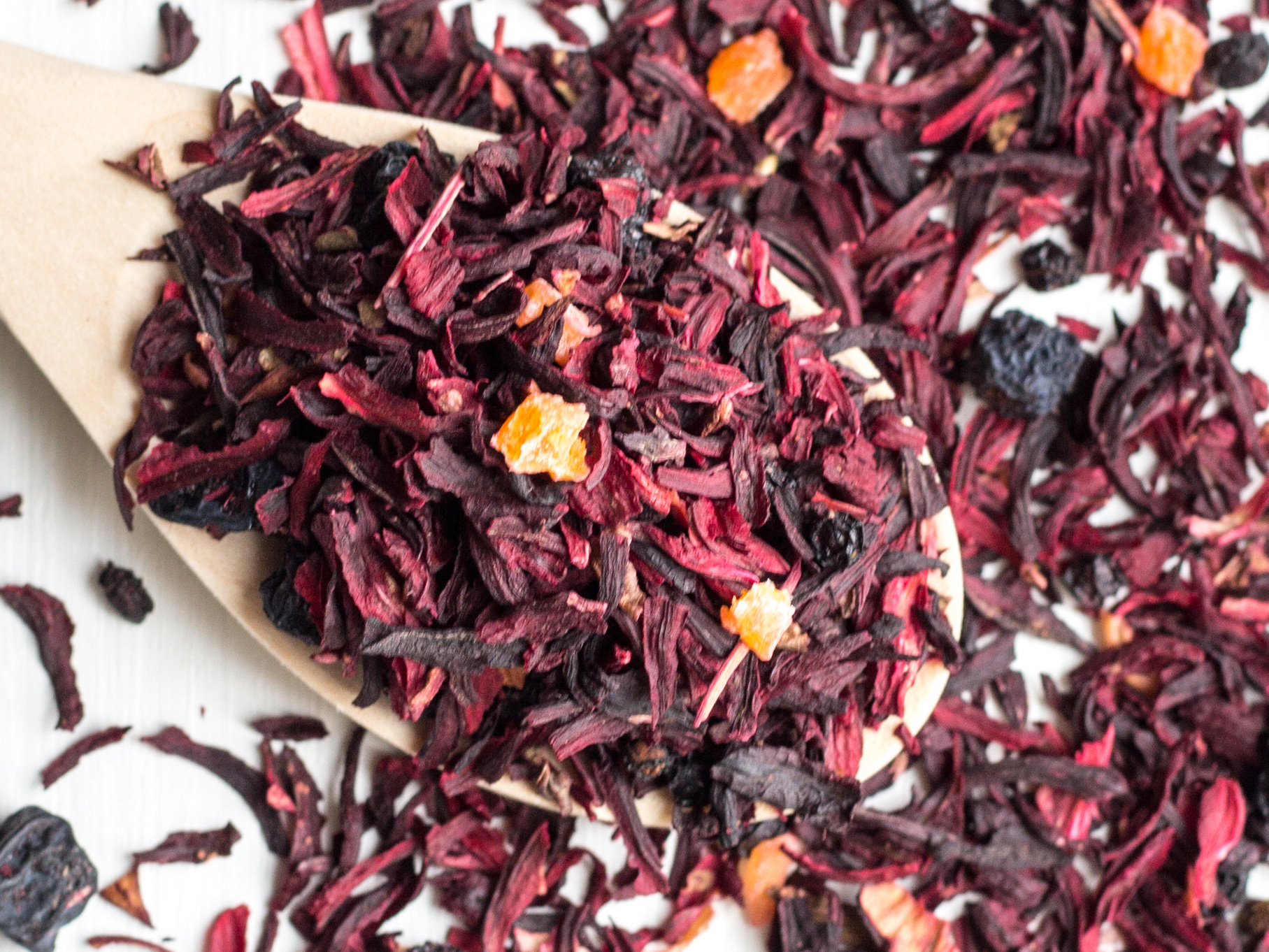 Фруктово-ягодный напиток на основе каркаде с добавлением черной смородины, черноплодной рябины, вяленого винограда, кусочков ананаса, ягод бузины и боярышника
