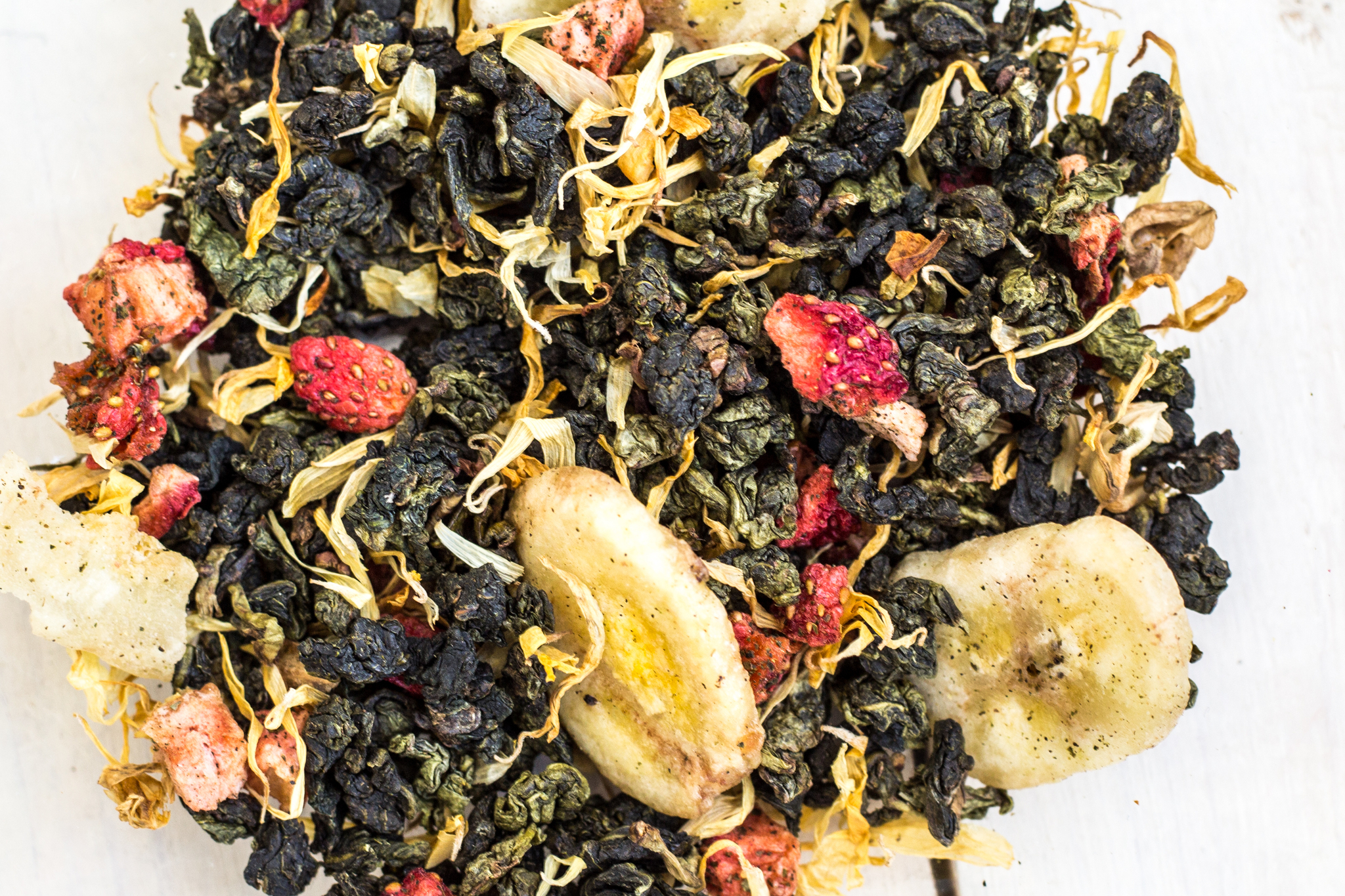Высокогорный китайский чай Те Гуань Инь с добавлением банановых чипсов, лепестков календулы, кусочков клубники и натуральных ароматических масел