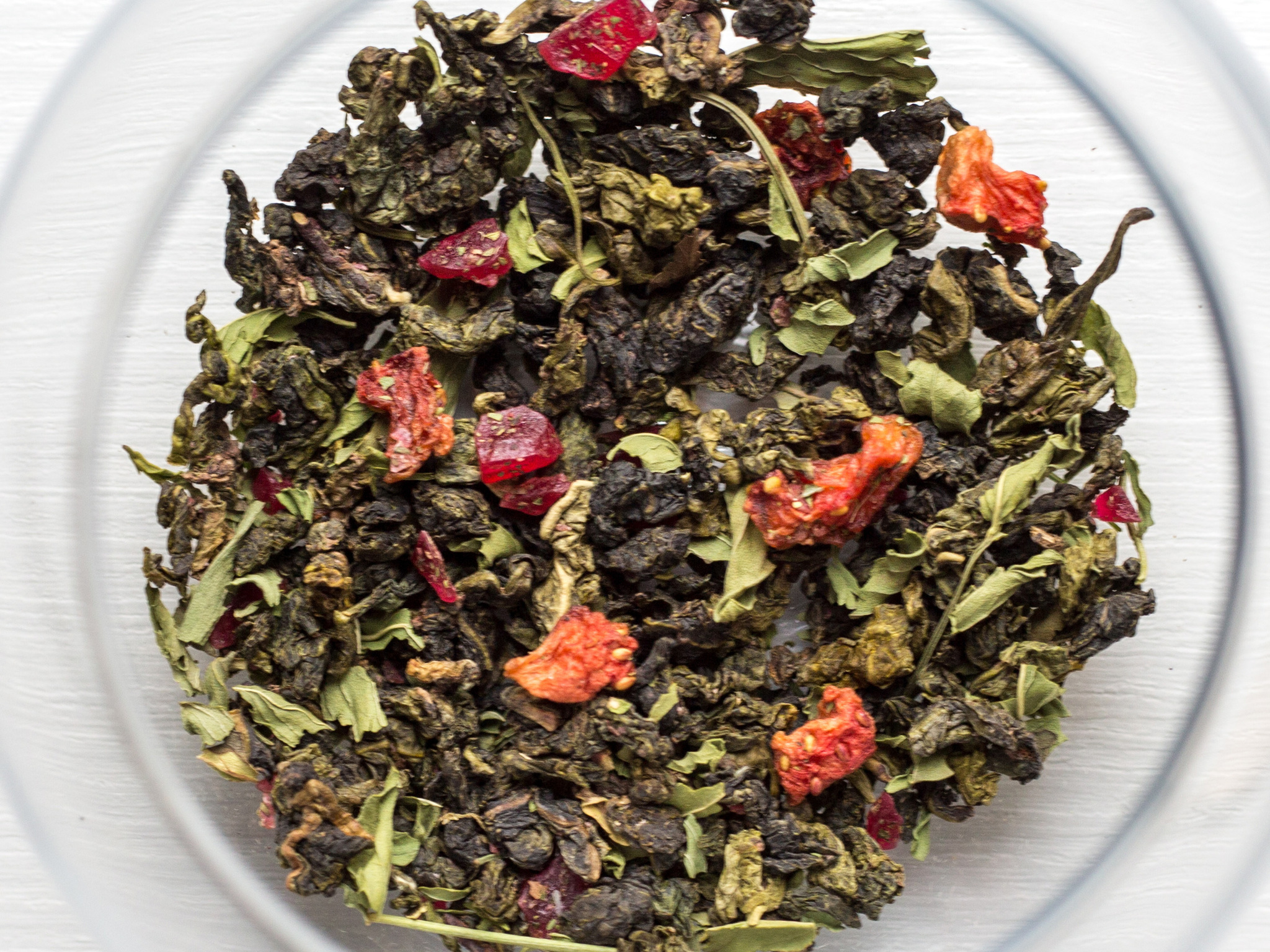 Высокогорный Те Гуань Инь с марокканской мятой и сегментами лимона, дополненный кусочками сублимированной клубники