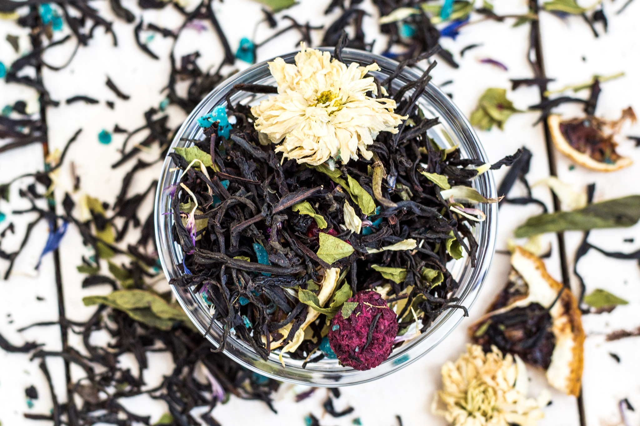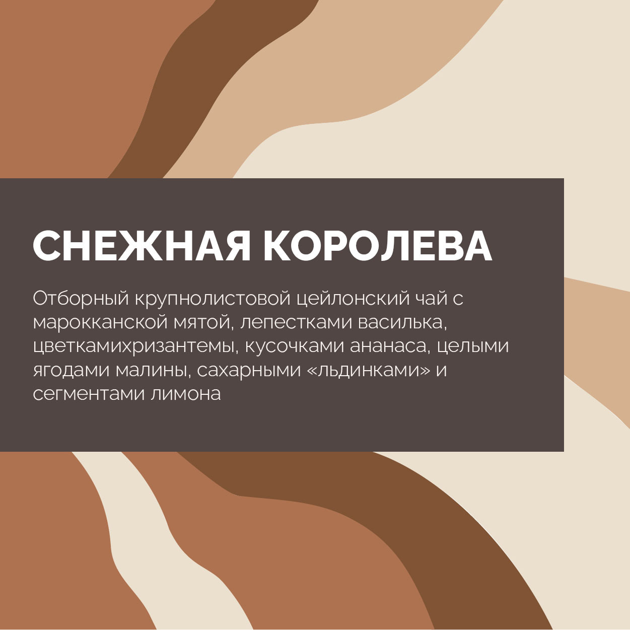 Отборный крупнолистовой цейлонский чай с марокканской мятой, лепестками василька, цветками хризантемы, кусочками ананаса, целыми ягодами малины, сахарными «льдинками» и сегментами лимона