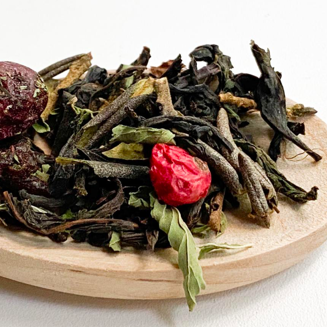 Чайный напиток со вкусом и ароматом экзотического саусепа на основе смеси из цейлонского чая и китайского многолетнего императорского пуэра Гун Тин с добавлением кусочков сушеного яблока, украшенный лепестками василька