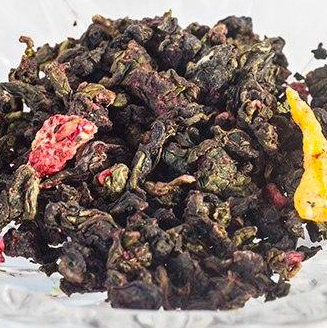 Чай Те Гуань Инь, дополненный сублимированными ягодами малины и ежевики, сегментами айвы, хурмой и колечками киви. В купаж добавлены слайсы клубники и манго.