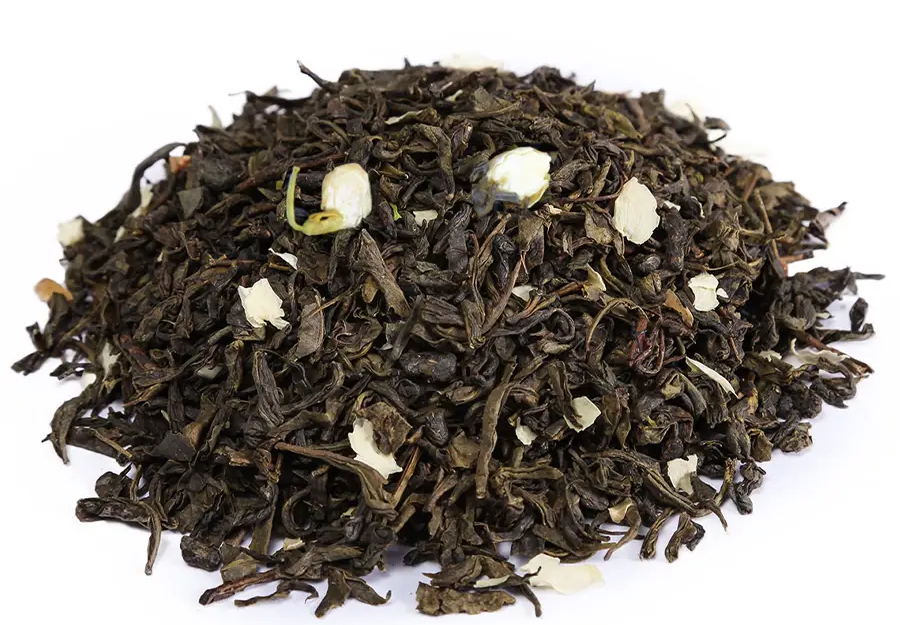 Натуральный китайский зеленый чай из провинции Фуцзянь с добавлением настоящих цветов жасмина. Настой имеет сладковатый, фруктово-медовый вкус, дополненный тонкими нотами жасмина.