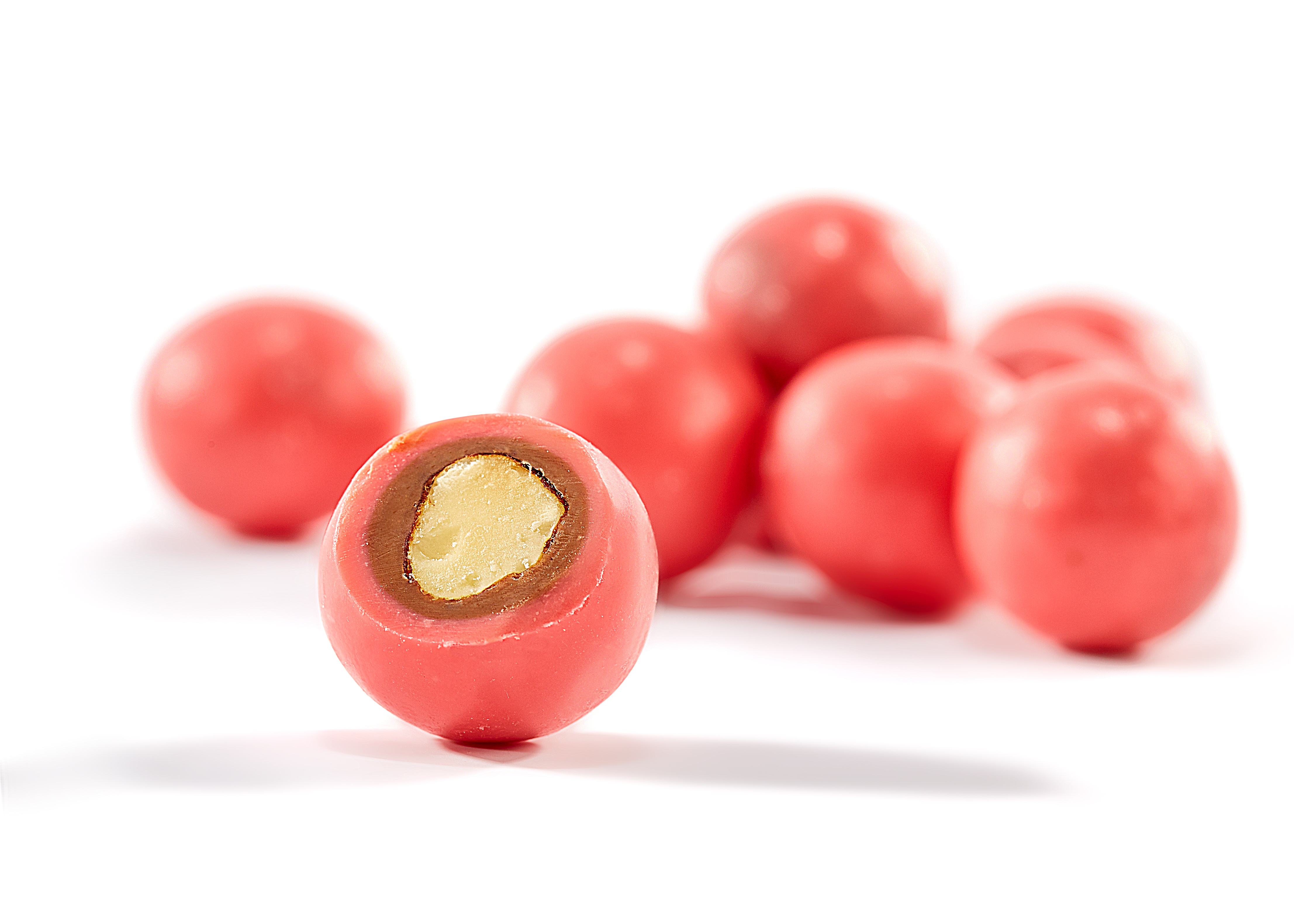 Обжаренный фундук, покрытый нежным клубничным шоколадом. Сочетает приятную хрусткость ореха, обволакивающую сладость шоколада и легкую кислинку ягоды.