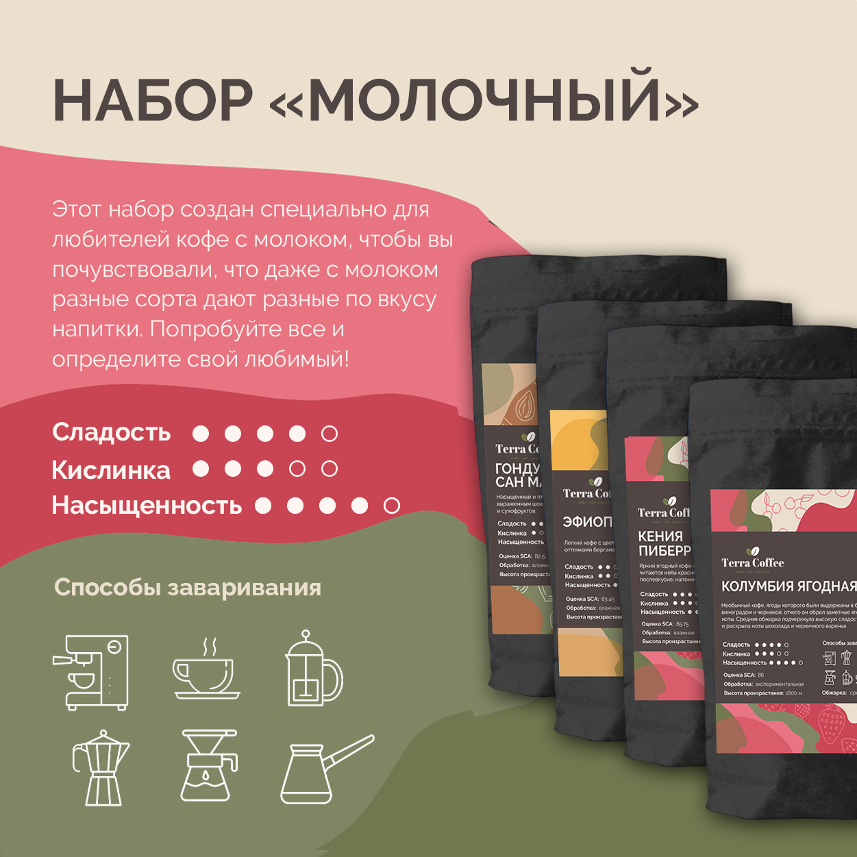Этот набор создан специально для любителей кофе с молоком, чтобы вы почувствовали, что даже с молоком разные сорта дают разные по вкусу напитки. Попробуйте все и определите свой любимый!